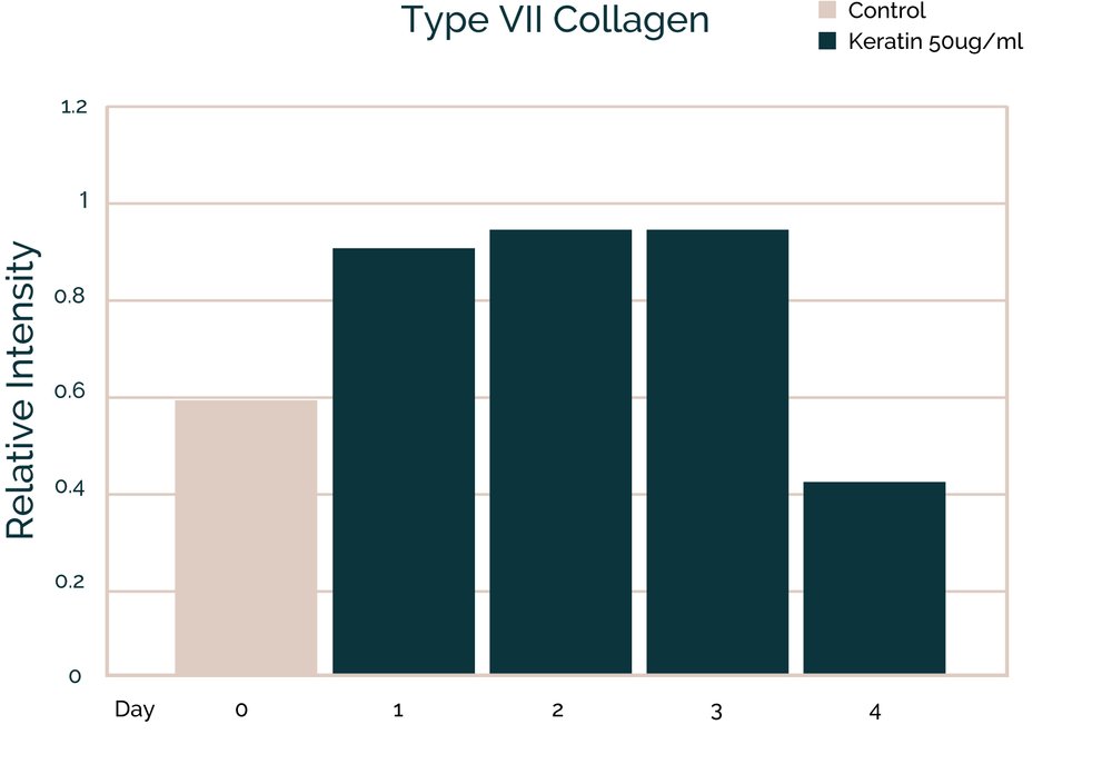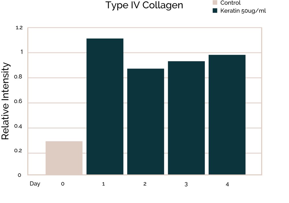 Tang et. al. demonstrated that well-nourished skin cells exposed to stress showed a 35% faster skin cell growth with keraGEN-IV® added as a nutrient compared to standard cell nutrients, in particular increasing production of collagen IV and collagen VII each day after introduction of the keratin. Skin cells stimulated by keraGEN-IV® produced 3x as much collagen IV as cells with no keraGEN-IV® present.